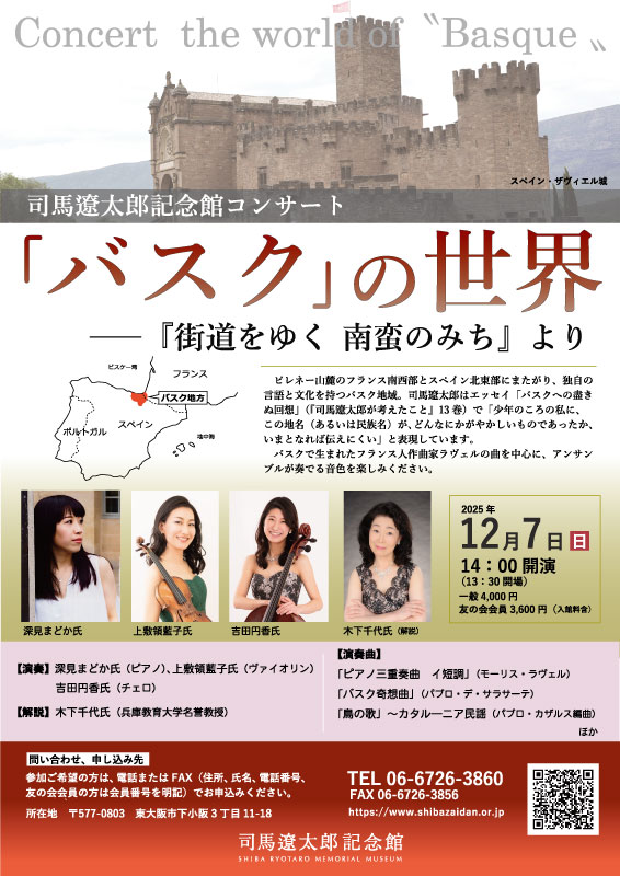 『街道をゆく 南蛮のみち』に描かれた「バスク」をテーマにしたコンサートを12月7日(日)、記念館ホールで開きます。